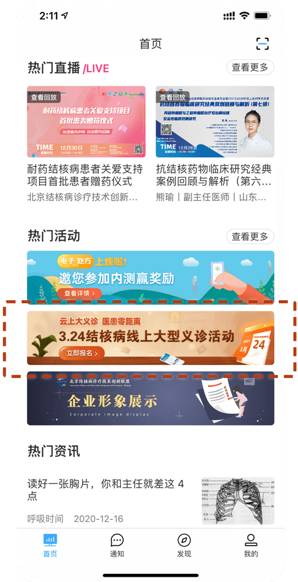 2、打开百医通APP,在首页的热门活动中点击“3.24结核病线上大型义诊活动”栏目进入活动页面。